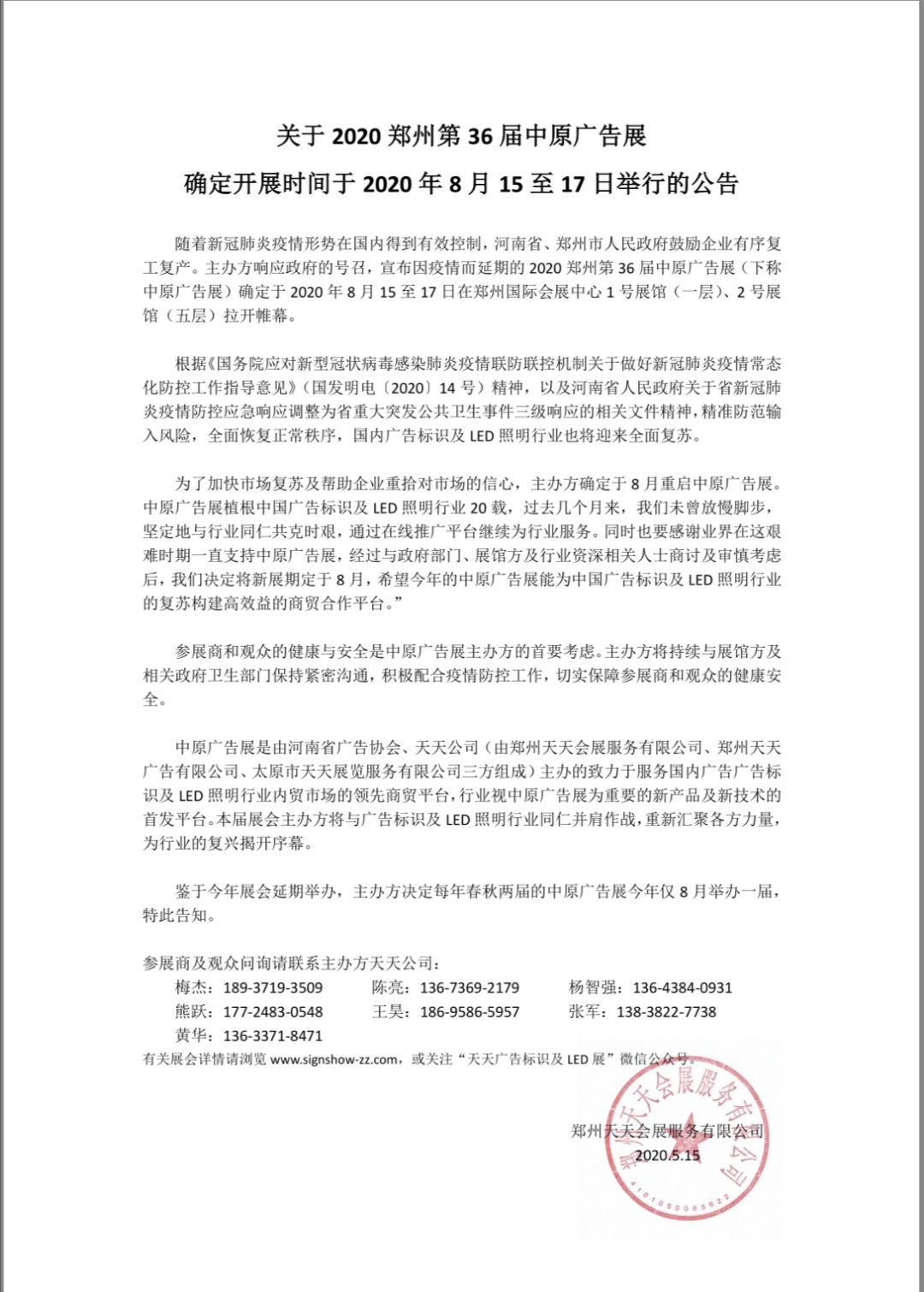 關(guān)于2020鄭州第36屆中原廣告展開展時(shí)間確定的通知